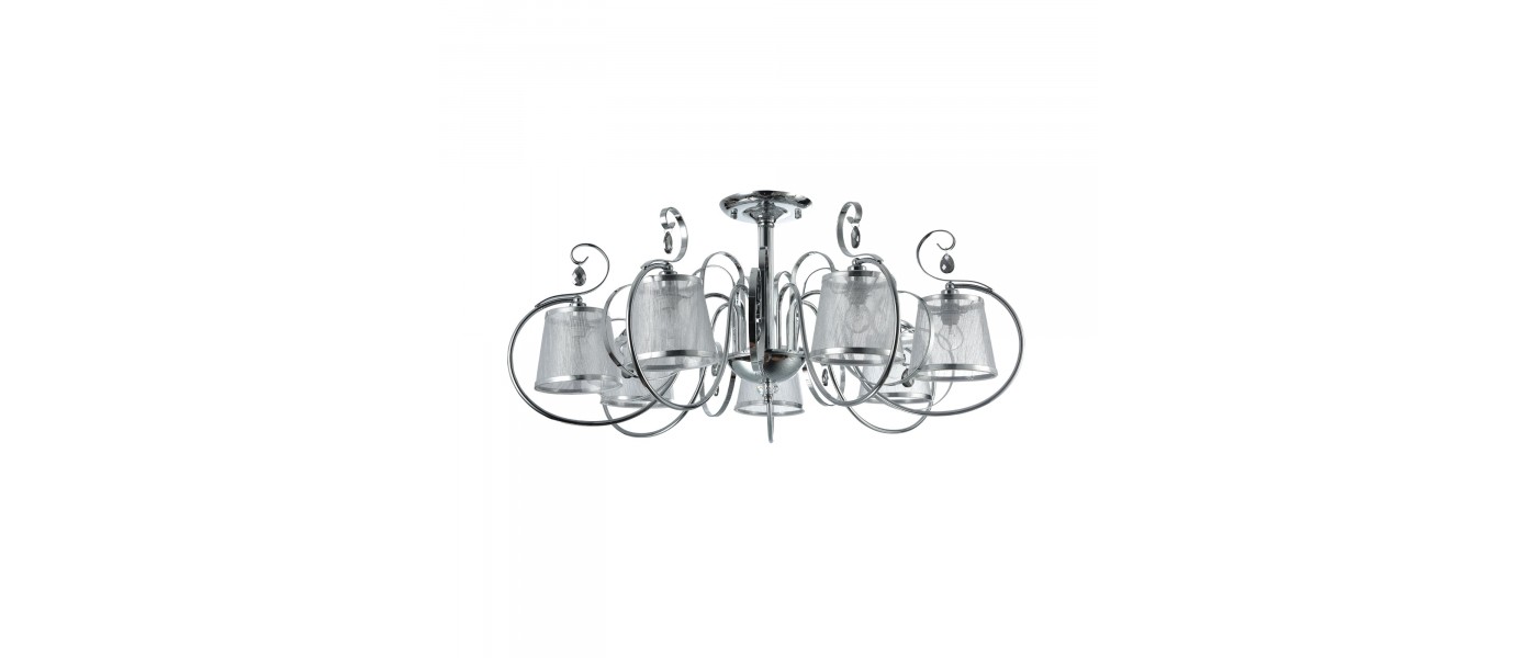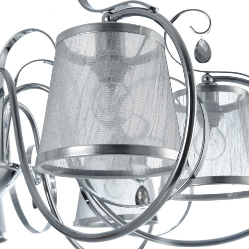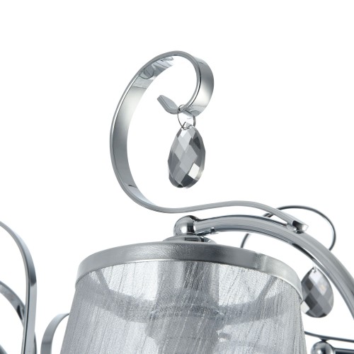 Абажуры и арматура светильников выполнены в разных цветах, с несколькими видами арматуры. Основание люстры украшено стеклянным декоративным элементом, а завитки рожков украшают подвески...