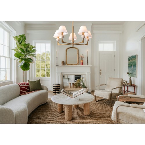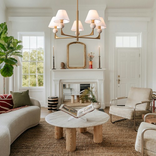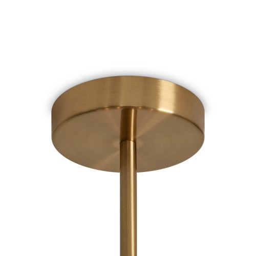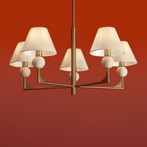Материал арматуры — металл. Цвет металла — латунь. Абажуры выполнены из белой ткани, которые мягко рассеивают свет. Потолочные и настенные светильники с цоколем E14. Декоративные элементы в форме шара на плафоне выполнены из травертина. Металлическая форма арматуры строгой геометрической формы с пла..