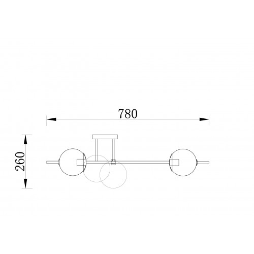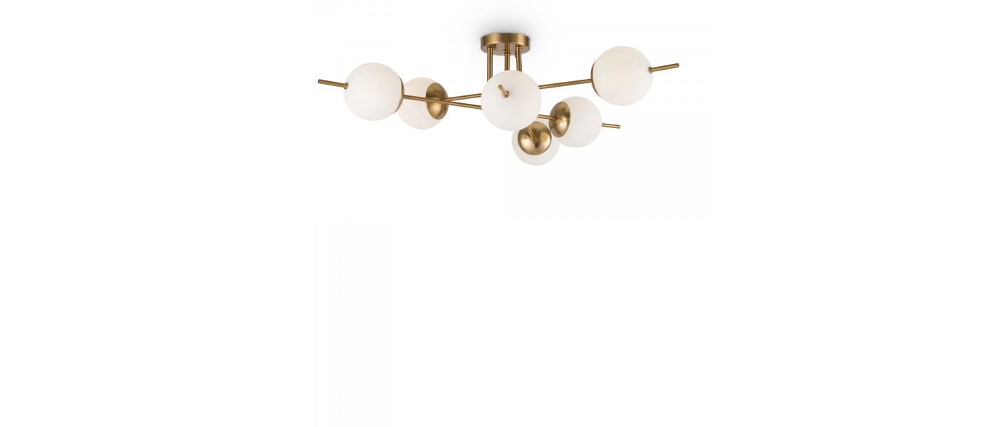 Арматура из металла. Цвет – латунь. Плафоны – матовое белое стекло. Трендовая геометрия в дизайне: арматура «пронизывает» плафоны-сферы. Источник света – лампа с цоколем Е27.