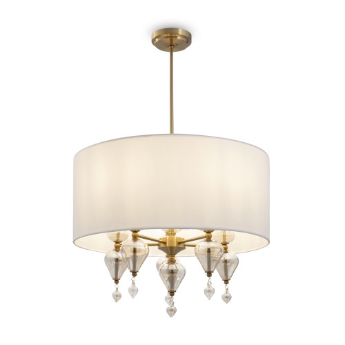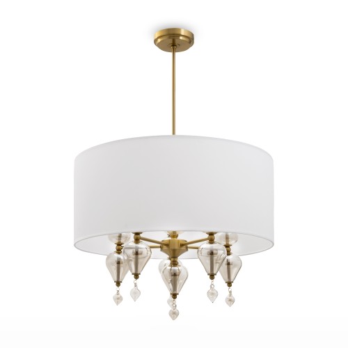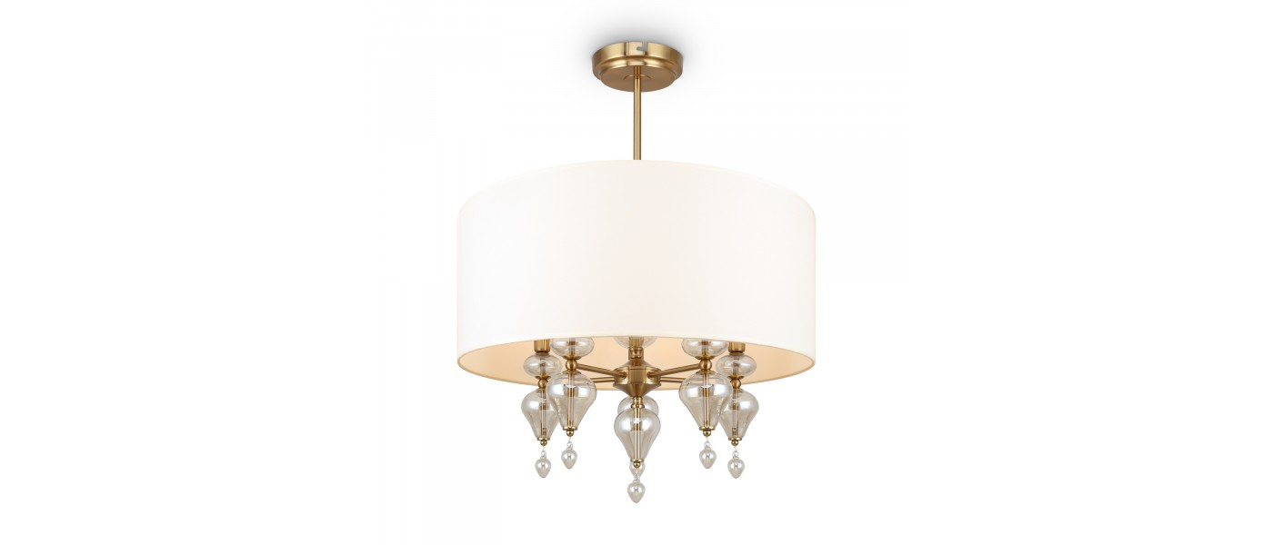 Арматура из металла, цвет — латунь. Плафоны — тканевые, молочного цвета. Металлическая конструкция декорирована выдувными стеклянными элементами с перламутровым напылением. Источником света служит лампа с цоколем Е14...