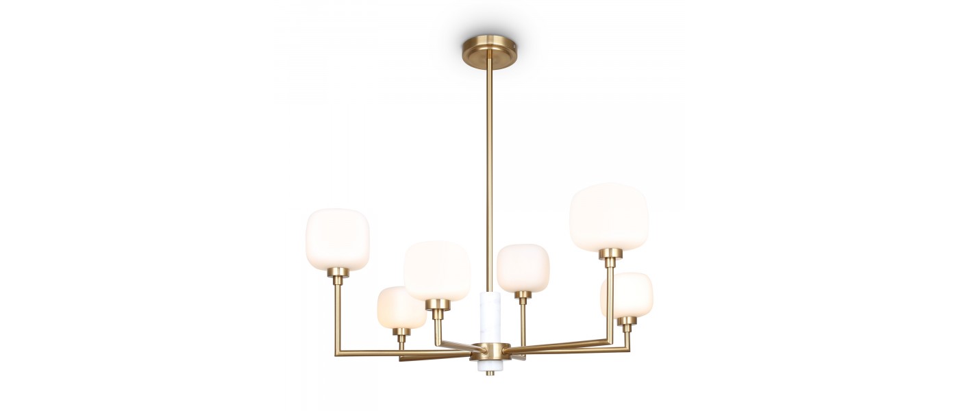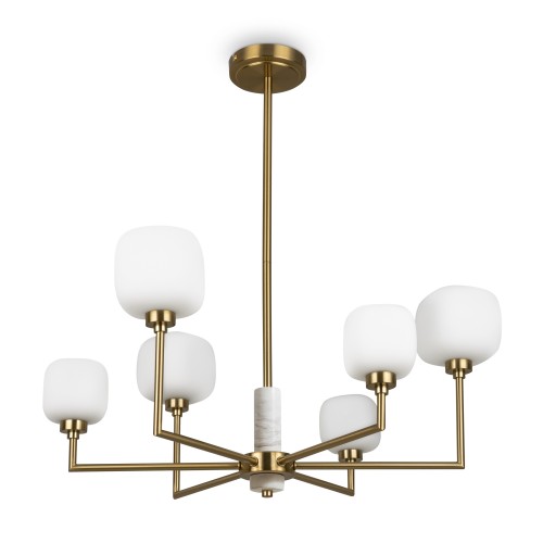 Металлическая графичная арматура цвета латунь. Плафоны из белого матового стекла в необычной форме округлых кубов - закреплены на разной по высоте комбинации. Мягкое равномерное освещение. Источником света служит лампа с цоколем G9...