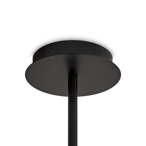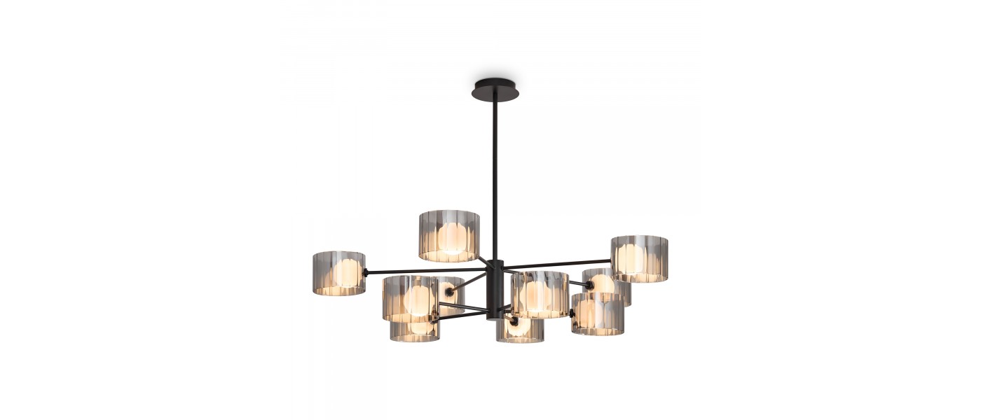 Арматура из металла. Основной цвет — чёрный, декоративные элементы в цвете латунь. Тканевые бежевые абажуры-цилиндры украшены чёрными металлическими основаниями. Компактные размеры для невысоких потолков. Источник света — лампа с цоколем Е14...