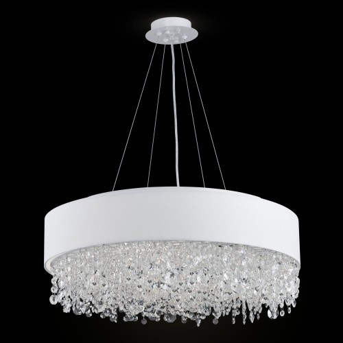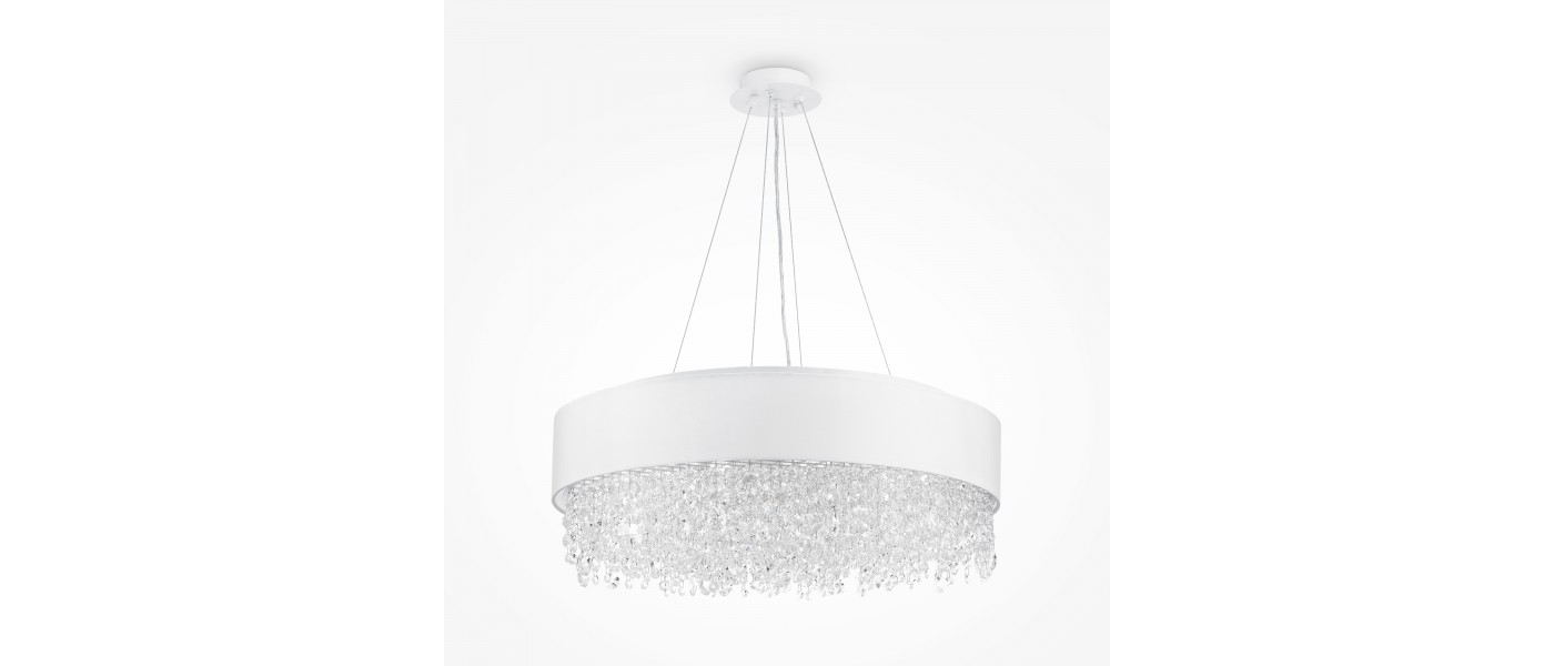 Металлическая арматура в белом цвете. Абажур – ткань, нанесенная на ПВХ, цвет – белый. Декор – подвески в виде граненых кристаллов. Высота подвесных светильников регулируется тросом...