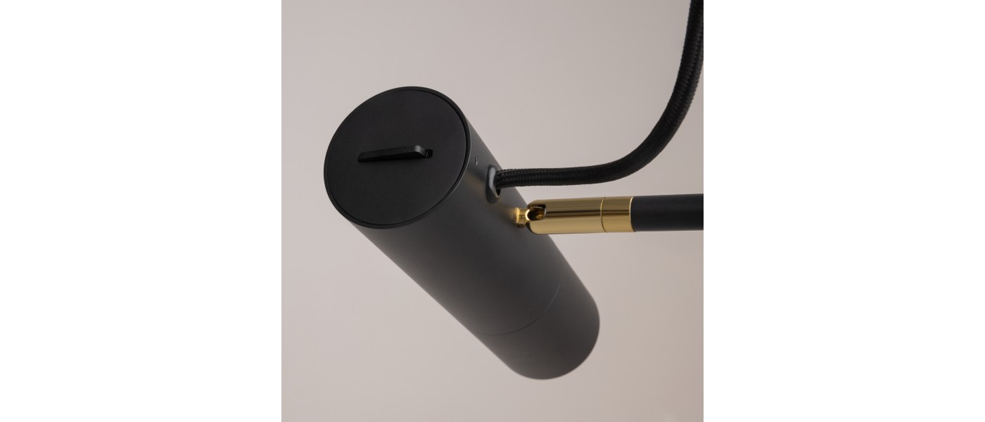 Металлическая арматура, оттенки – черный, белый. Плафон-цилиндр из металла в тон арматуре. Минималистичный дизайн..