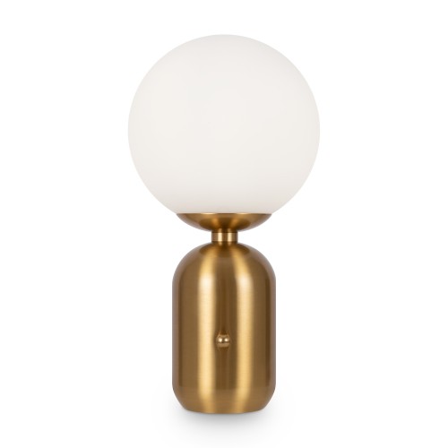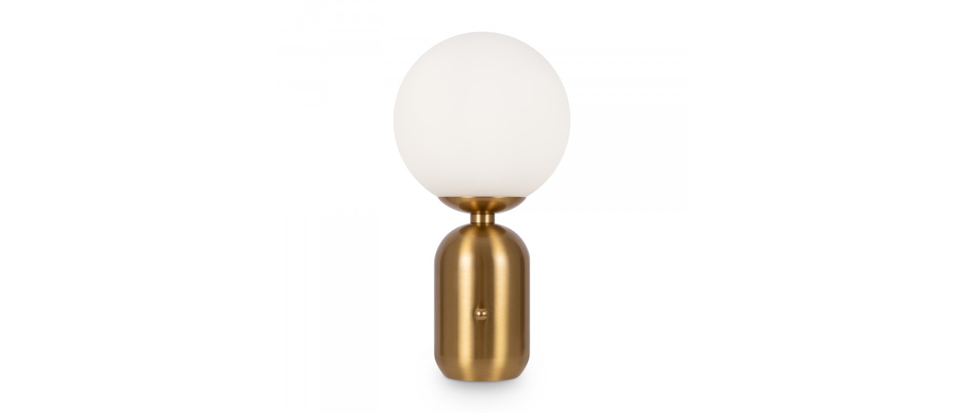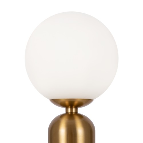 Материал арматуры — металл, цвета - латунь, черный. Плафон-сфера из белого матового цвета. Функция Touch позволяет включать и выключать свет. Источник света - лампа с цоколем Е14...