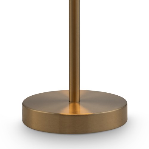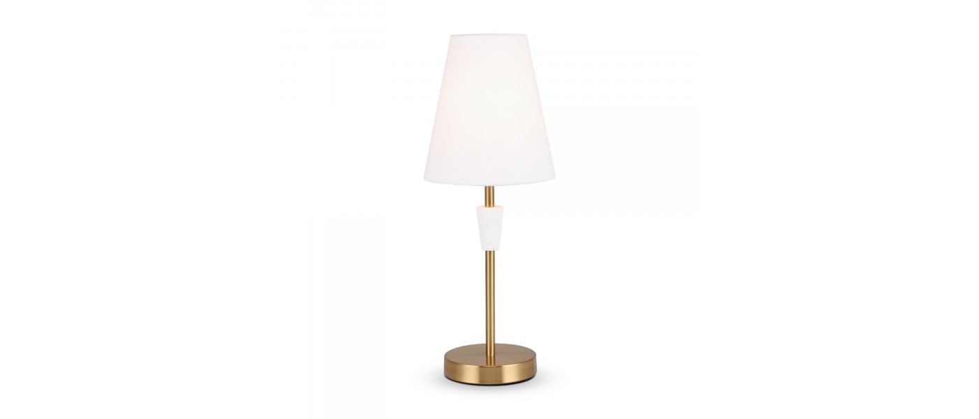 Металлическая арматура в цвете латунь. Дополнительные элементы — минималистичные вставки из натурального белого мрамора. Белые абажуры из ткани в форме конуса. Источник света — лампа с цоколем Е14 или Е27.