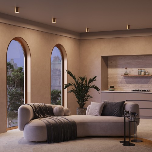 Материал корпуса – металл; цвет – белый, чёрный и золотой. Форма корпуса – стаканчик. Акриловый рассеиватель. Сияющий эффект при свечении. Отсутствие стопорного кольца. Утопленный источник света – лампа GU10...